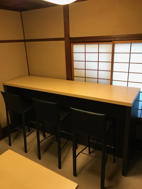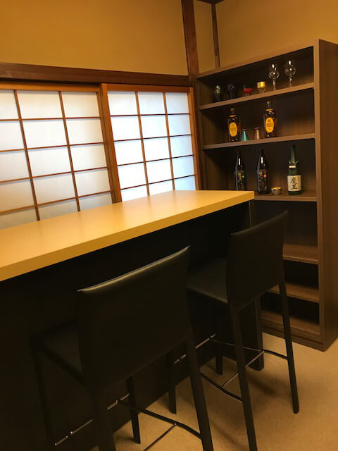 2階の6畳間の内装改修工事高級感のあるサロン風にしたいというご要望で、お持ちの椅子に合わせて、カウンターとボトルラックを造作致しました。